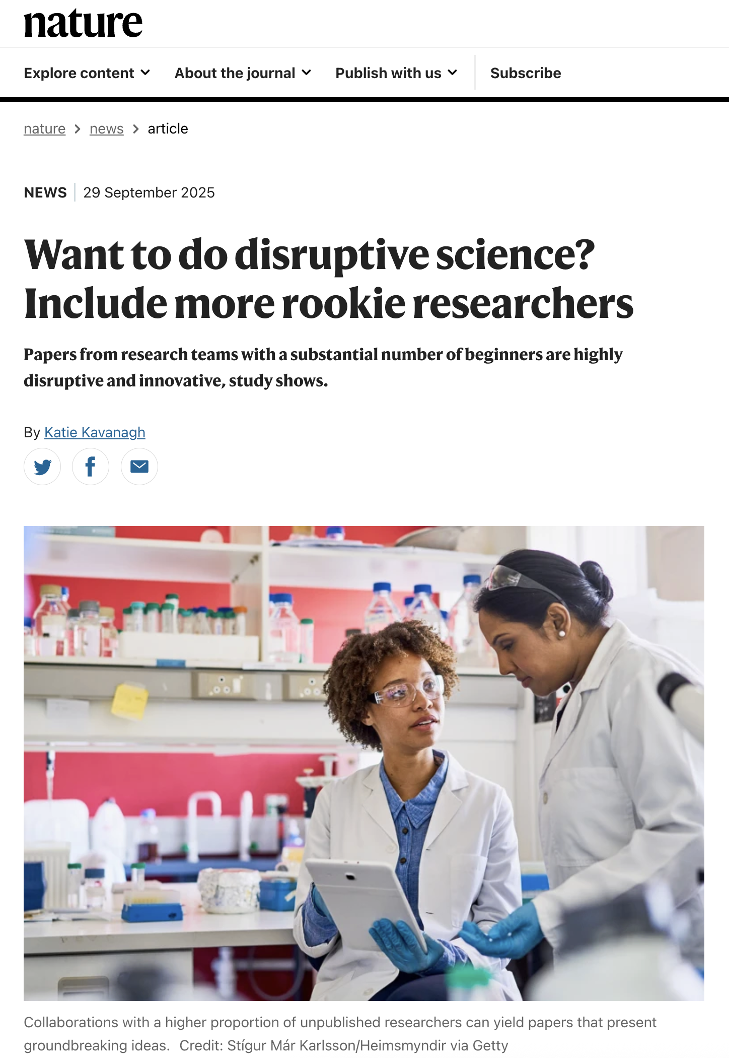 Paper: “Beginner’s Charm: Beginner-Heavy Teams Are Associated With High Scientific Disruption.” https://arxiv.org/pdf/2509.10389